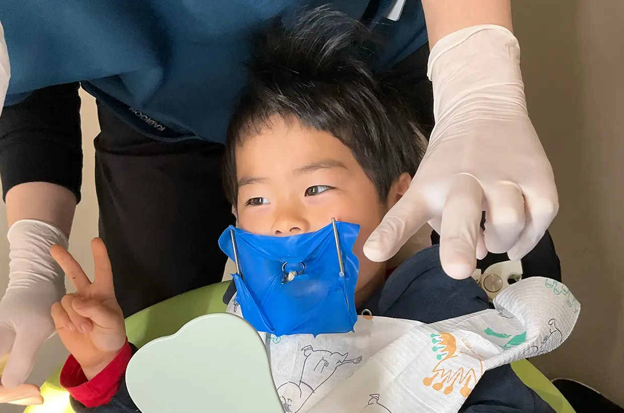 当院では、舌や頬を傷つけないためにほぼ100%子どもの虫歯治療にはラバーダム防湿を行います。